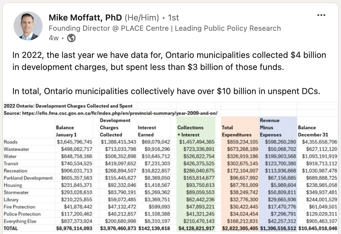 Toronto’s DCCs have increased by 1000% since 2010 — consumer prices are up 41% in the same time period. Using publicly available data, the same author shows how much of this funding was used by municipalities in 2022 for infrastructure improvements.